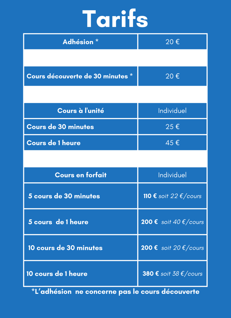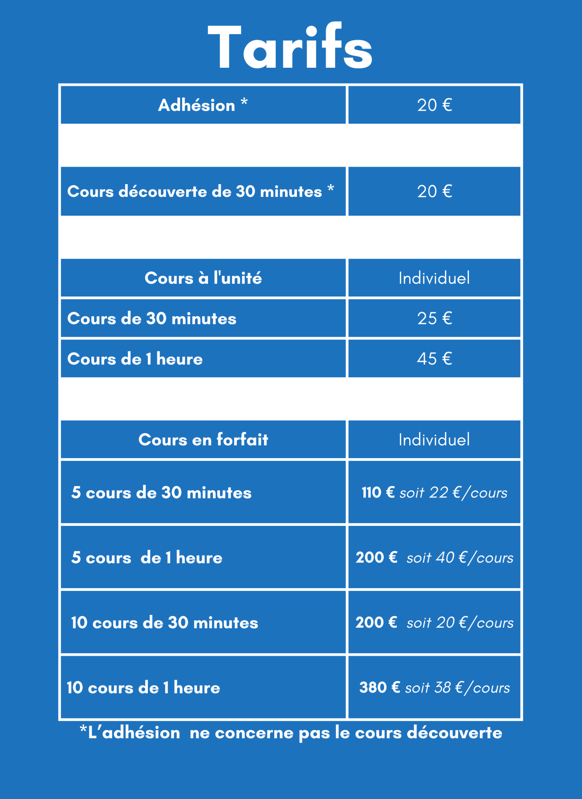 ** : Ce tarif n’inclut pas l’adhésion annuelle de 10€ qui est à ajouter obligatoirement.